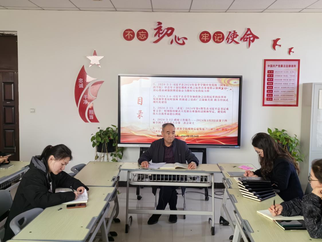 最后,与会教职工对习近平总书记在看望参加政协会议的民革科技界环境资源界委员时强调《积极建言资政广泛凝聚共识,助力中国式现代化建设》和2024年3月5日在第十四届全国人民代表大会第二次会议上的《政府工作报告》进行自学和讨论并交流心得,提出深入学习领会全国两会精神,切实把学习成效转化为推动学院高质量发展的实际行动;立足工作职能,找准工作突破口和结合点,推进学院教育教学工作发展。