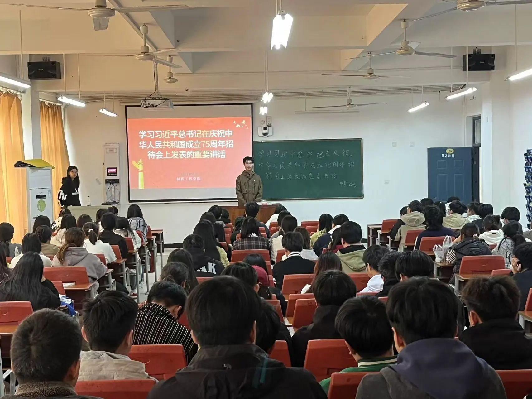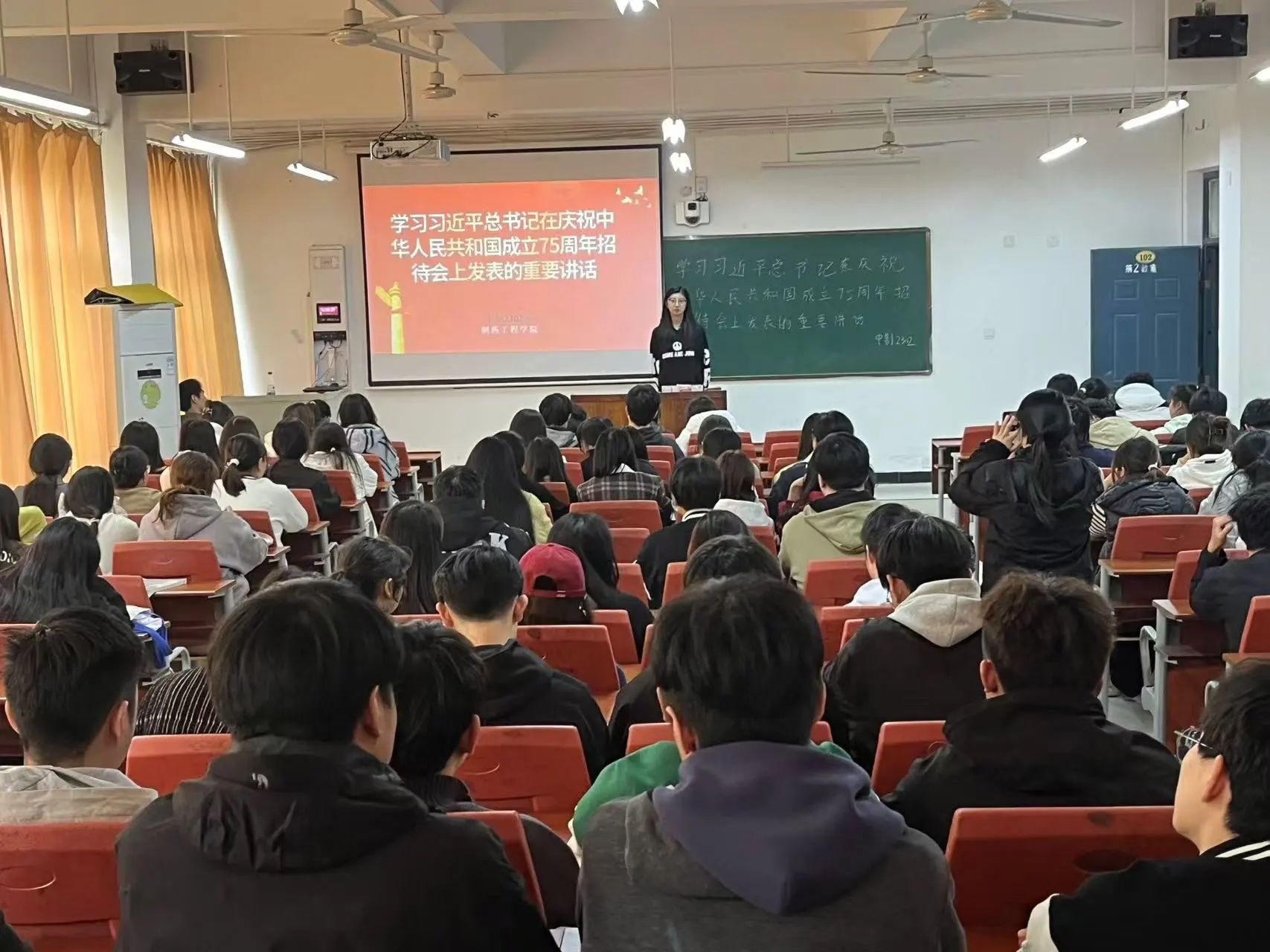 在主题团课上,各班团支书首先为同学们解读了习近平总书记在庆祝中华人民共和国成立75周年招待会上的重要讲话,带领同学们回顾了中华人民共和国成立75年来的艰苦历程与取得的诸多成就,并强调了习近平总书记提出的新时代新征程下党和国家的中心任务,着重指出习近平总书记重要讲话精神对于当代大员工的指导意义。