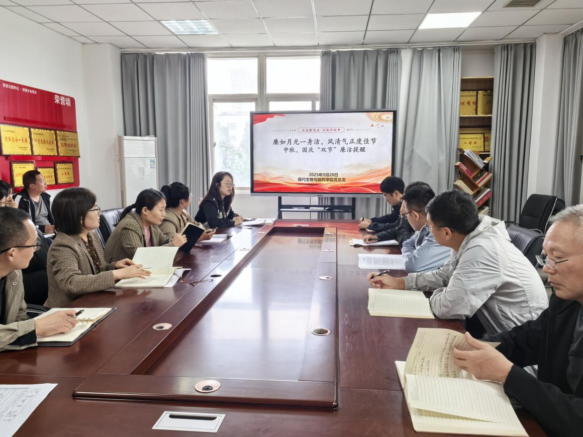 根据学校纪检监察处安排,现代生物与制药学院党总支于2025年9月28日下午在301党员活动室开展中秋、国庆廉洁教育警示谈话专题会,本次会议由学院党总支副书记白小茗主持,全体教职工参加。
