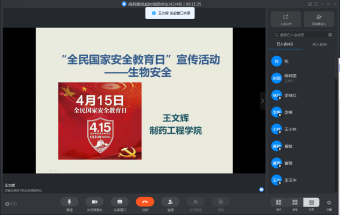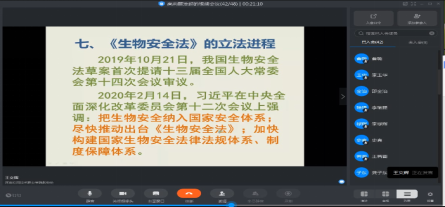 王老师宣讲的主要内容有:全民国家安全教育日的由来及内容;生物安全;国际上涉及生物安全的公约以及我国制定的与生物安全相关的法律法规;我国《生物安全法》的立法进程以及《生物安全法》包含的主要内容。