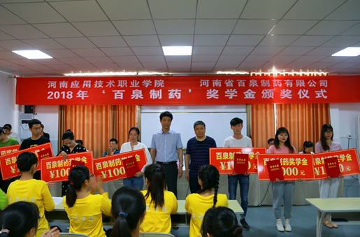 我院有6名同学获得“百泉制药”奖学金。在“百泉制药”奖学金颁奖仪式上,河南省百泉制药有限公司总经理与副总经理共同为获奖员工颁发了2018年度“百泉制药”奖学金与证书。