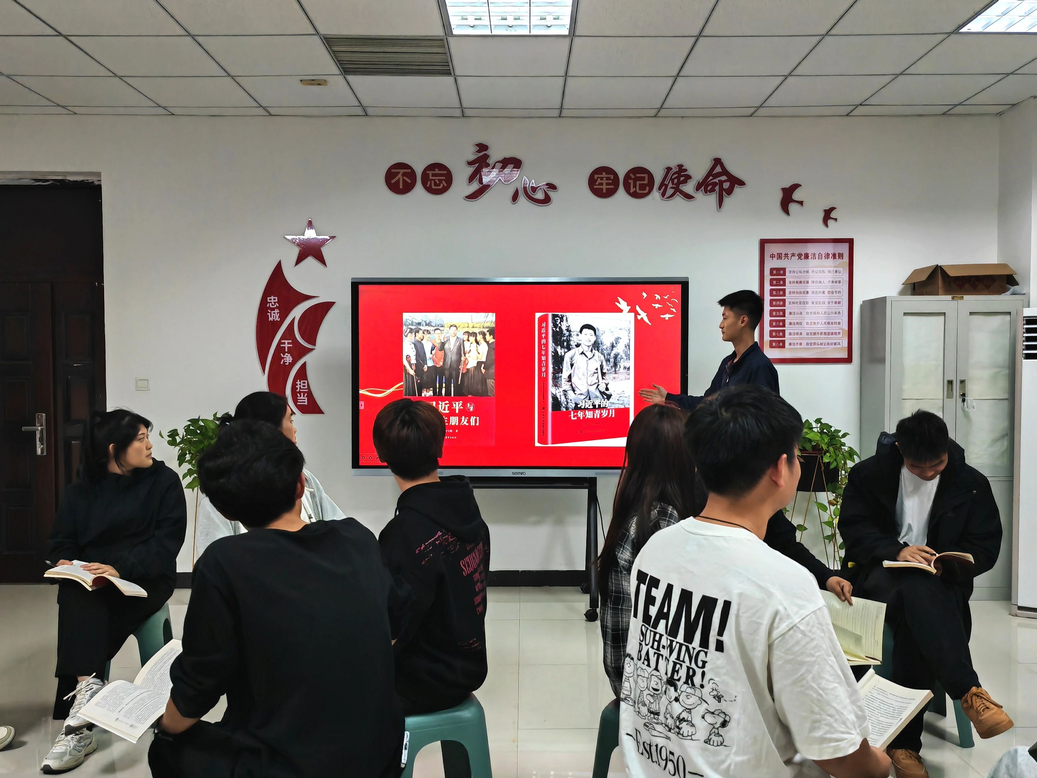 员工干部闫文昊向大家分享了《习近平与大员工朋友们》和《习近平的七年知青岁月》两本大员工青年读物,并分享了自己的读书感受。他表示,这两本读物由四个关键词“真诚、坚定、吃苦、勤学”引出习主席与大员工之间的点点滴滴,全景展现了习近平同志在从政不同时期与青年大员工交流交心交友的故事,使同学们能够跨越时空感受到从而更加全面地理解“两个确立”的决定性意义。