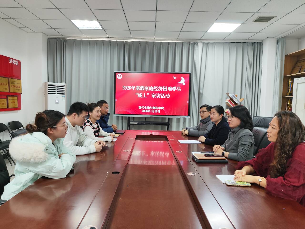 为扎实推进资助育人工作,切实关心家庭经济困难员工寒假生活状况,1月26日,现代生物与制药学院以线上视频连线形式,开展2026年家庭经济困难员工“线上”家访活动。学院党总支书记梁艳、院长王湘妍、党总支副书记王俊永、副院长高莉丽、资助专员焦汉生及辅导员代表参与此次活动,与员工代表进行“零距离”线上交流。