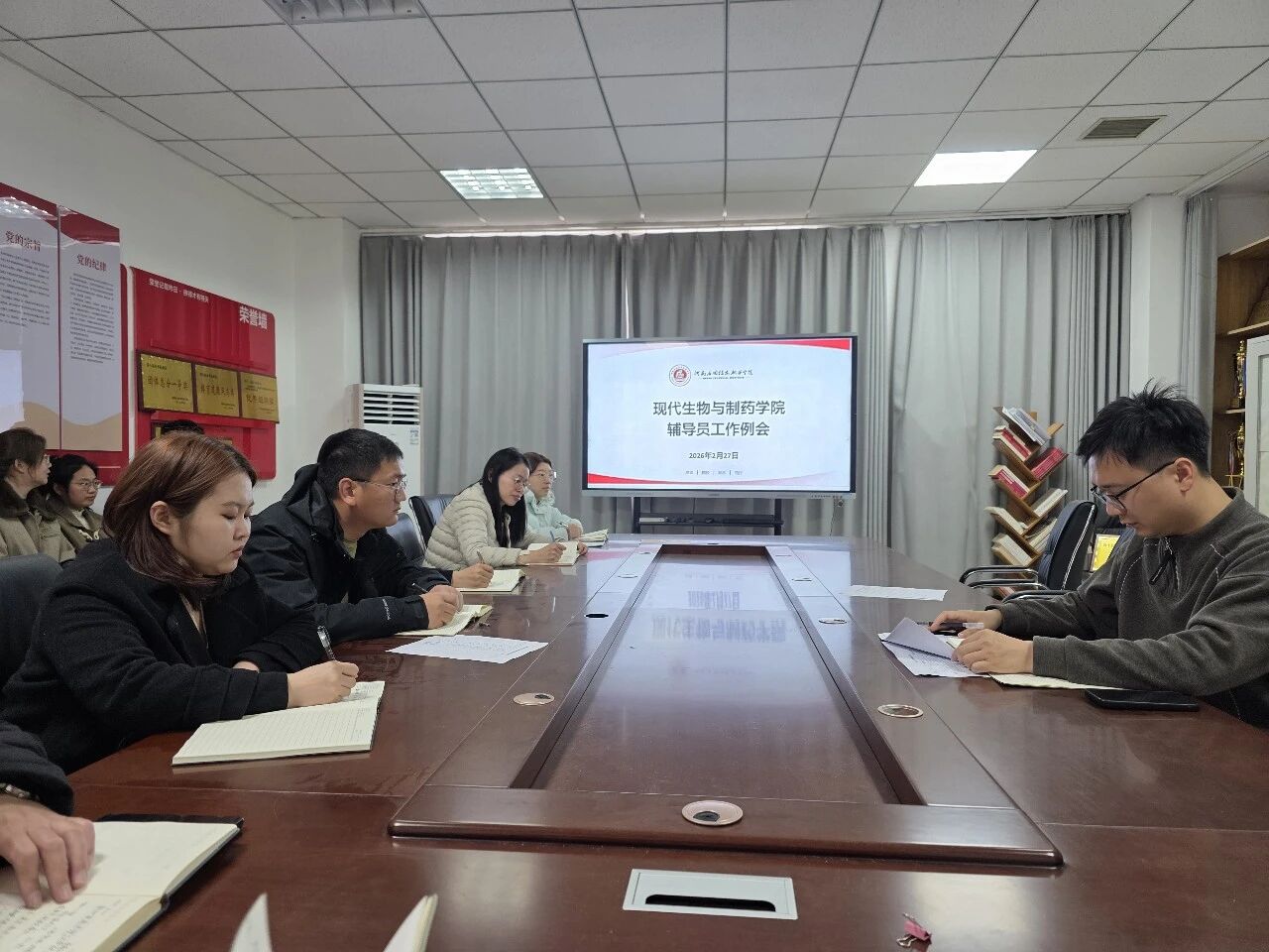为扎实做好员工管理工作,明确工作方向,压实育人责任,2月27日,现代生物与制药学院在办公楼301活动室召开2026年春季学期第一次辅导员工作例会。党总支副书记王俊永主持会议,全体专兼职辅导员参加。