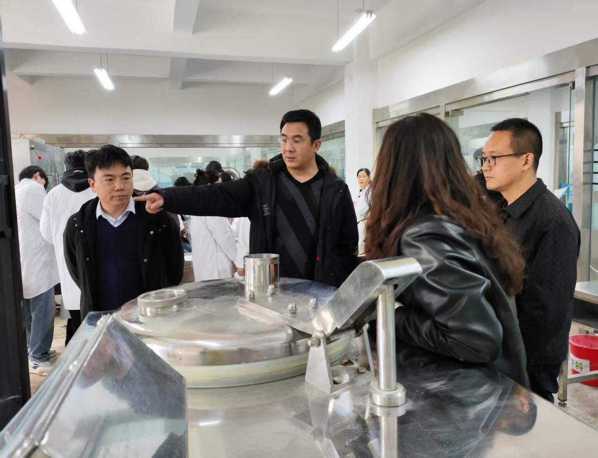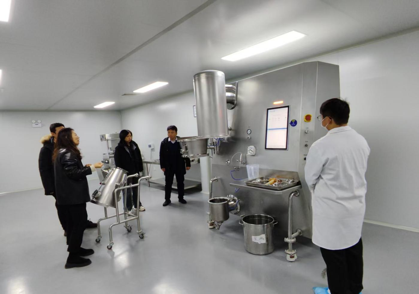 在高莉丽的带领下,来访嘉宾参观了我院液体、固体制剂生产实训车间及智慧GMP综合实训车间。现代化的生产设备以及标准化的操作流程得到了企业代表的高度认可。双方重点围绕“胃肠充盈造影颗粒试剂”的工艺优化展开探讨,技术团队现场演示了流化床制粒技术在原料处理中的应用,针对颗粒粒度、流动性、溶化性等关键指标进行了参数优化与实验验证。