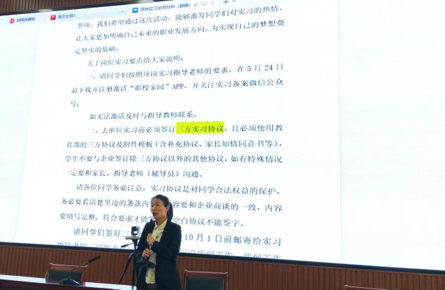 高莉丽结合企业实际,向同学们介绍了职场文化和实习注意事项。她强调,企业非常重视实习生的培养,希望通过实习平台,让同学们更好地了解企业运作,希望同学们能够珍惜机会,努力学习,为企业发展贡献力量。